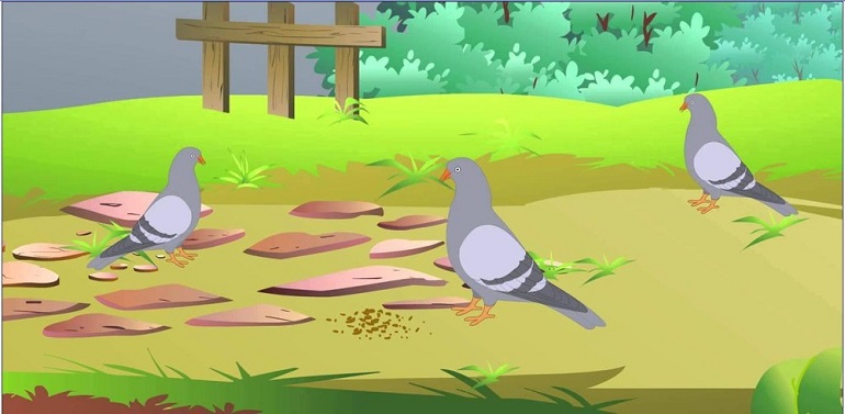 Đúng lúc này, có một đàn chim bồ câu đang bay gần đó. Chúng nhìn thấy có rất nhiều hạt thóc nên đã sà xuống ăn. Chẳng mấy chốc, chúng bị mắc kẹt trong chiếc lưới của người thợ săn. Dù rất sợ hãi nhưng con chim đầu đàn đã nghĩ ra một kế hoạch. Nó bảo với cả đàn: “Trong khi người thợ săn chưa quay về, chúng ta hãy hợp lực lại để mổ rách chiếc lưới này. Sau đó, một con sẽ thoát ra và tìm kiếm sự giúp đỡ”.