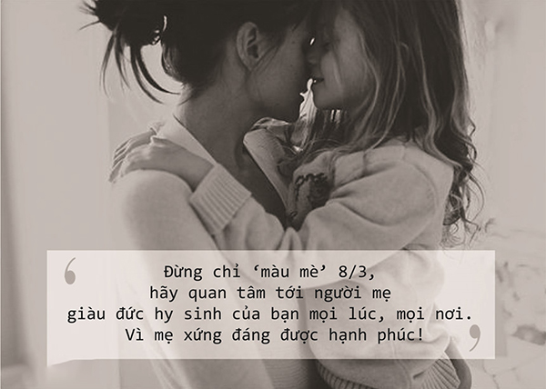 Tất nhiên, con luôn tâm niệm không nhất thiết phải đợi đến 8/3 mới tặng hoa, nấu cho mẹ bữa cơm, chắc chắn là không! Cũng chẳng riêng 8/3, con mới “sến” với mẹ. Con biết mẹ xứng đáng được còn nhiều hơn thế.