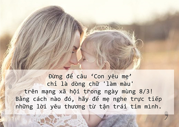 Bởi thế, hàng trăm hàng ngàn dòng trạng thái trên mạng không bằng một câu chúc trực tiếp và chân thành dành cho mẹ. Dù ở xa hay ở gần, bằng cách nào đó, chúng ta hãy khiến mẹ vui bằng những lời yêu thương tận từ trái tìm mình.