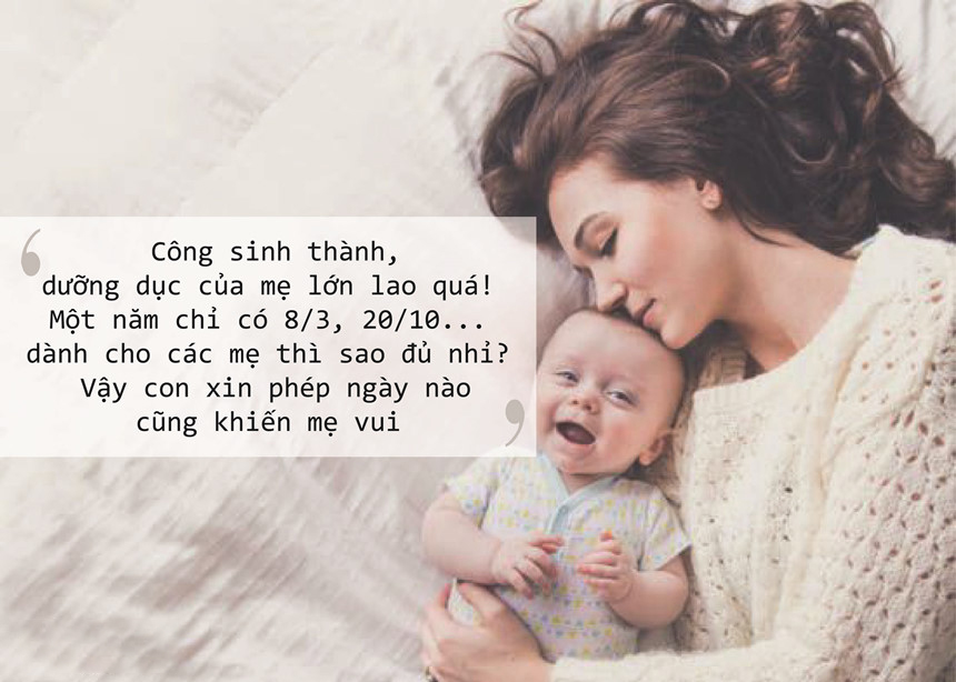 Mẹ cho con hình hài, dòng sữa ngọt ngào, dạy con từng bước đi, bảo bọc con suốt cuộc đời. Con khôn lớn thành người là nhờ mẹ, cuộc đời con bình yên cũng vì có mẹ. Bởi vậy, mẹ xứng đáng được hạnh phúc vào mọi lúc mọi nơi. Và bổn phận của người con là làm được điều đó.