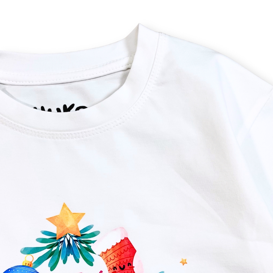 Áo thun trắng Noel AT52_F thiết kế unisex cho bé trai & bé gái, họa tiết người tuyết – cây thông nổi bật mang không khí Giáng Sinh vui tươi. Chất liệu cotton mềm mịn, thấm hút tốt, bé mặc thoải mái không bí da, phù hợp đi chơi – chụp hình Noel – dự tiệc cuối năm. Form suông basic dễ phối cùng quần jeans, váy, yếm,… giúp bé có outfit đẹp mắt và đáng yêu.