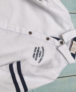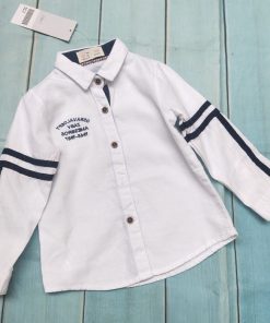 Áo sơ mi bé trai sọc xanh ASM37, áo sơ mi trắng sọc viền xanh in chữ trên nền trắng nổi bật.