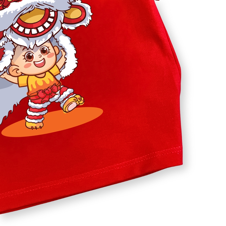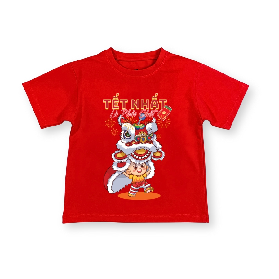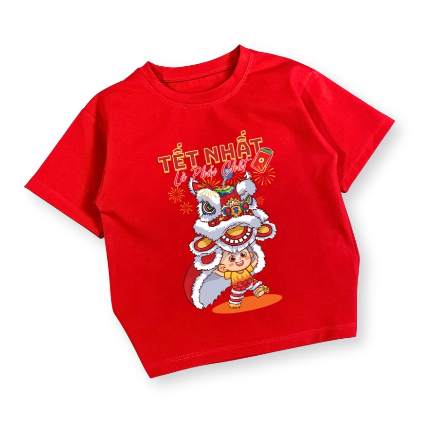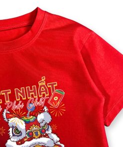 Hình in múa lân sắc nét, màu tươi, không bong tróc khi giặt đúng cách. Màu đỏ Tết lên form rất đẹp, chụp hình Tết nổi bật, hợp không khí đoàn viên. Áo dễ mặc, dễ phối đồ, phù hợp mặc đi chúc Tết ông bà, đi chơi xuân, đi lễ hội hoặc mặc trong các hoạt động Tết ở trường lớp.