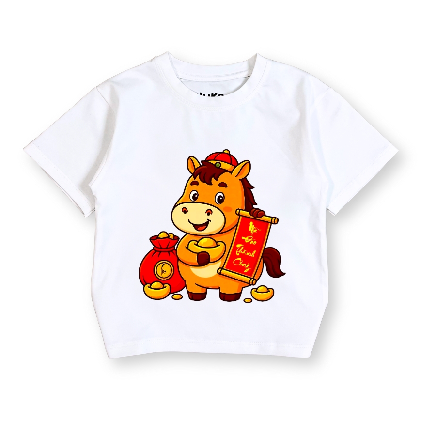 Áo thun tết cho bé trai & bé gái màu trắng hình ngựa chúc tết chất cotton dày co giãn AT54_B