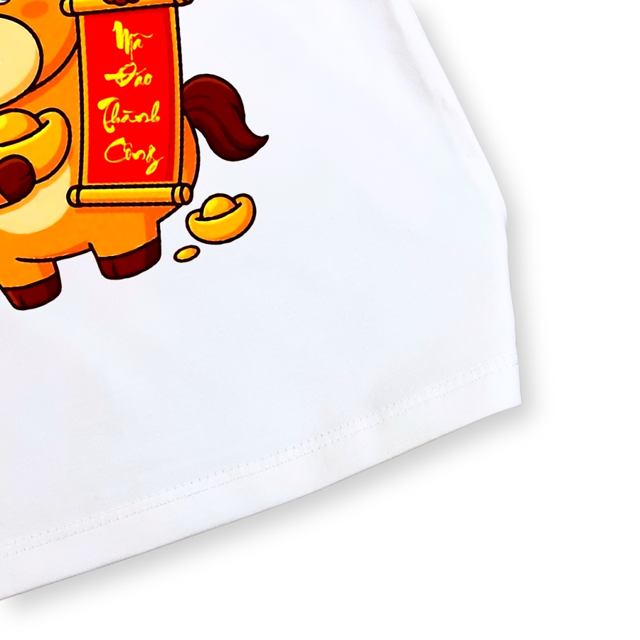 Áo thun Tết AT54_B được thiết kế dáng thun tay ngắn form unisex hiện đại phù hợp cho cả bé trai và bé gái, màu trắng Tết nổi bật tượng trưng cho may mắn tài lộc đầu năm, họa tiết chú ngựa cầm chữ “Mã Đáo Thành Công” mang ý nghĩa chúc Tết tốt lành, thành công và suôn sẻ, hình in bố cục cân đối dễ nhìn không rối mắt, phong cách vừa dễ thương vừa khỏe khoắn, dễ phối cùng quần jean, quần kaki, quần short hay chân váy cho bé mặc đi chơi xuân, chụp ảnh Tết hay đi chúc Tết ông bà.