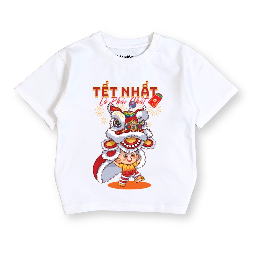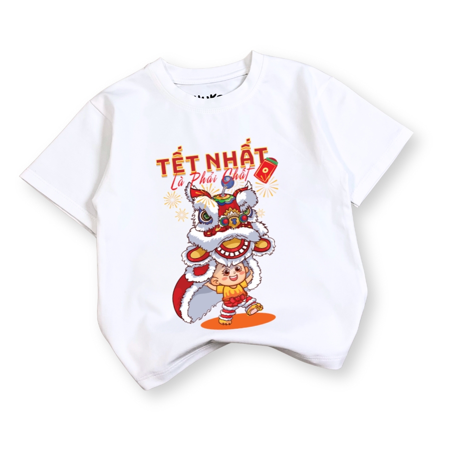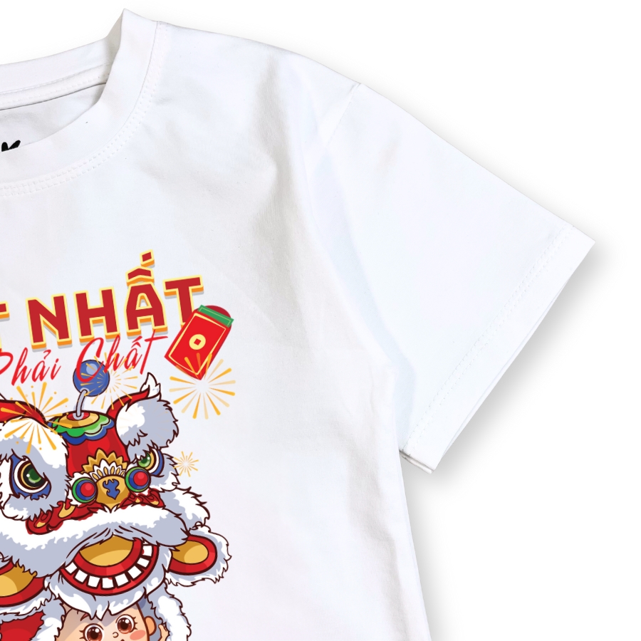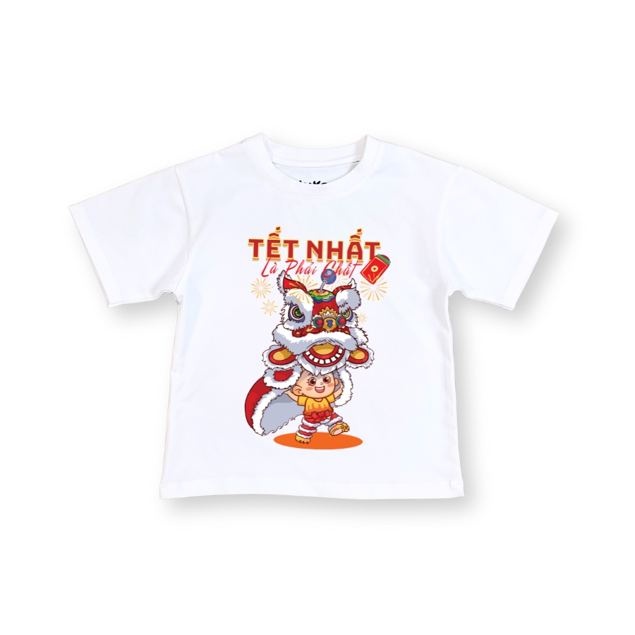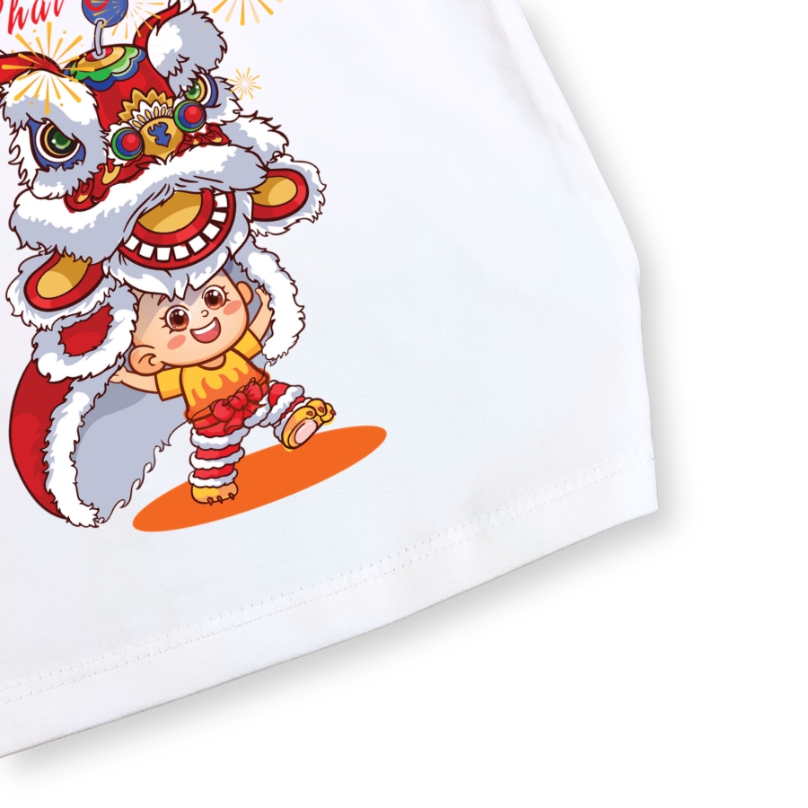 Hình in múa lân sắc nét, màu tươi, không bong tróc khi giặt đúng cách. Màu trắng Tết lên form rất đẹp, chụp hình Tết nổi bật, hợp không khí đoàn viên. Áo dễ mặc, dễ phối đồ, phù hợp mặc đi chúc Tết ông bà, đi chơi xuân, đi lễ hội hoặc mặc trong các hoạt động Tết ở trường lớp.