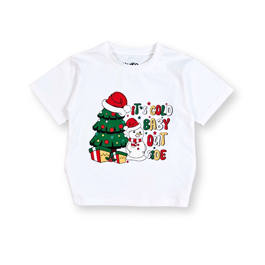 Áo thun Noel cho bé được may từ chất liệu cotton mềm mịn, thoáng mát, giúp bé vận động thoải mái cả ngày. Chất vải co giãn nhẹ, không gây bí da và phù hợp cả khi bé chạy nhảy nhiều. Bề mặt vải mịn, không xù lông sau khi giặt, giữ form áo luôn đẹp. Mực in hoạt tiết người tuyết – cây thông sử dụng kỹ thuật in sắc nét, bền màu. Đường may chắc chắn, hạn chế bung chỉ, an toàn với làn da trẻ nhỏ.