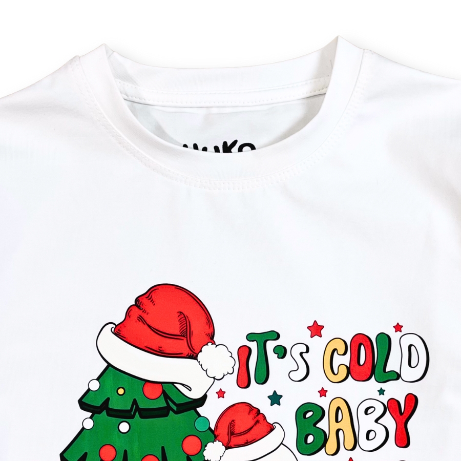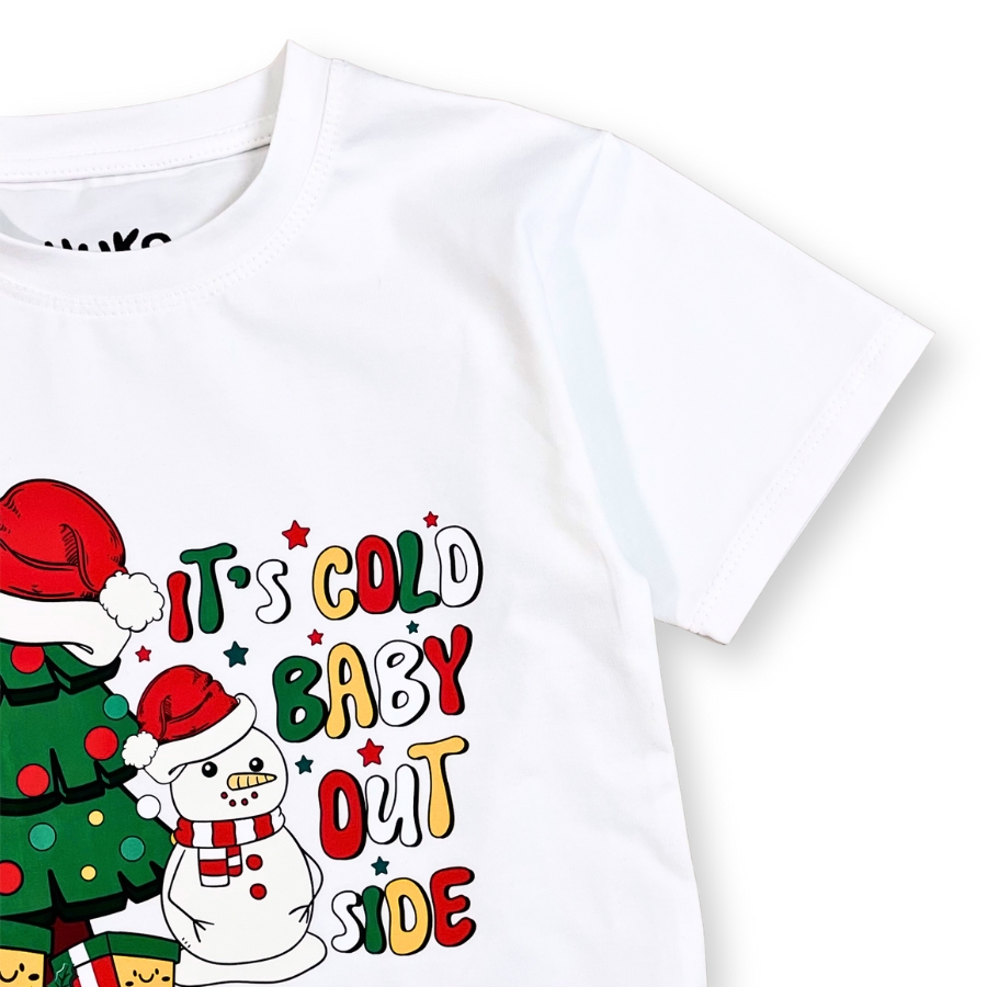 Áo form suông basic dễ mặc, phù hợp với cả bé trai và bé gái. Tông màu trắng sáng tạo sự nổi bật khi kết hợp cùng họa tiết Giáng Sinh vui nhộn. Hình người tuyết đội mũ Noel bên cây thông & quà tặng giúp bé thêm nổi bật trong mùa lễ hội. Từng chi tiết in đều nổi rõ, màu xanh – đỏ chủ đạo mang không khí Noel ấm áp. Dễ phối đồ, có thể mix cùng quần jean, chân váy, yếm jean, quần short cho bé.
