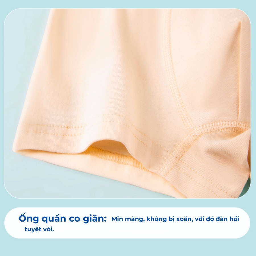 Combo 4 quần chip đùi QS10 được làm từ vải cotton co giãn thoáng mát, mềm mịn và thấm hút mồ hôi tốt, phù hợp cho bé mặc cả ngày dài. Đường may vắt sổ kỹ lưỡng, chắc chắn từng chi tiết giúp quần không bung chỉ, không cộm, không gây khó chịu khi bé vận động nhiều hay ngồi lâu.