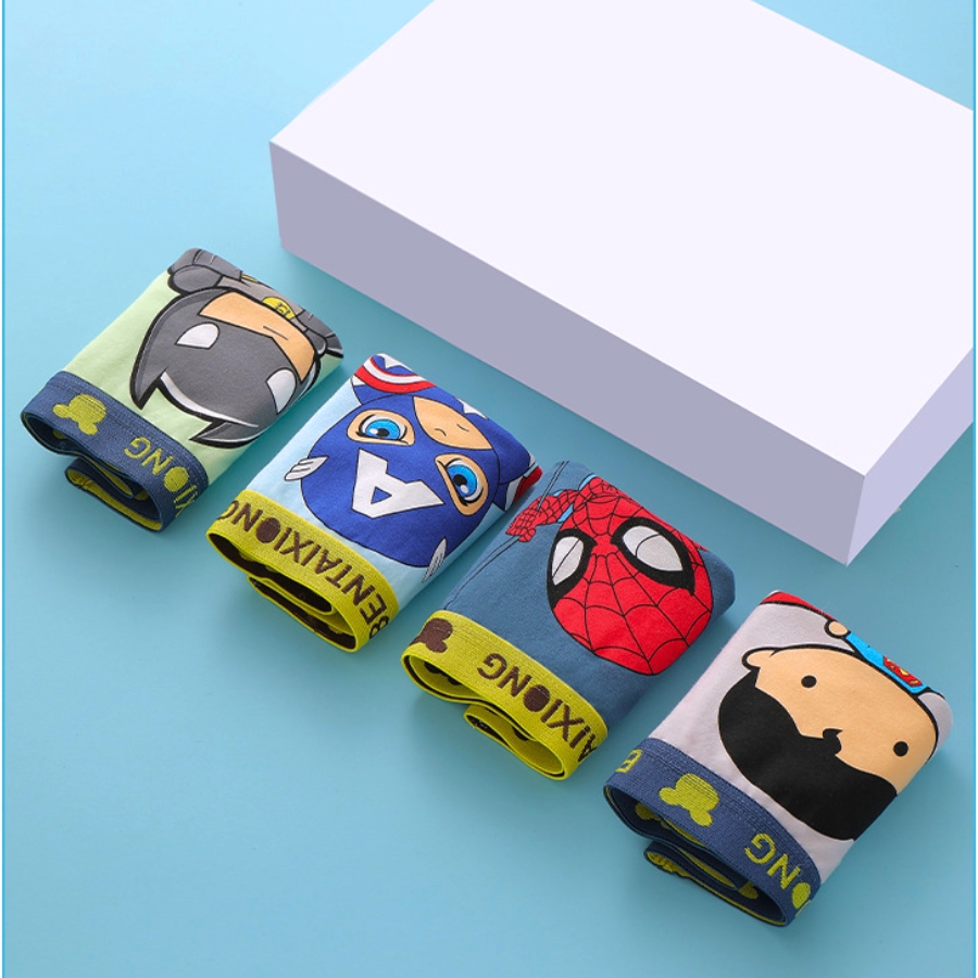 Sản phẩm gồm combo 4 chiếc quần chip đùi với 4 màu sắc và 4 họa tiết siêu anh hùng khác nhau; từng chiếc được đóng gói sạch sẽ, đảm bảo vệ sinh trước khi giao đến tay khách; bộ sản phẩm không kèm phụ kiện khác nhưng đầy đủ số lượng và màu sắc đúng cam kết; hộp/quai đóng gói cẩn thận giúp quần giữ form trong quá trình vận chuyển; thích hợp dùng làm quà tặng cho bé trai dịp sinh nhật, lễ Tết hoặc dùng hằng ngày.