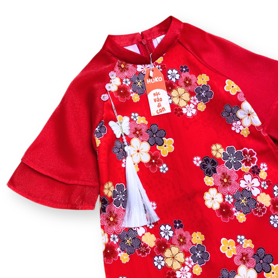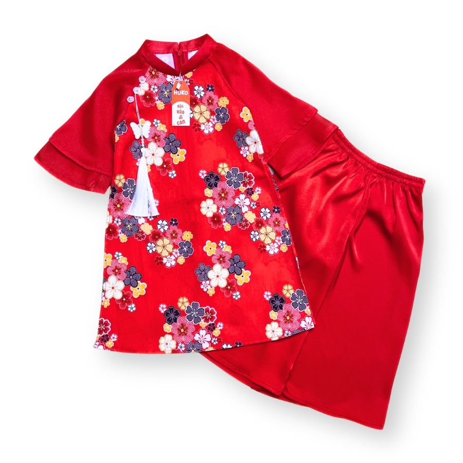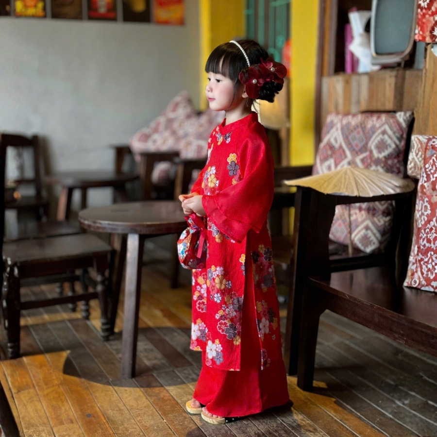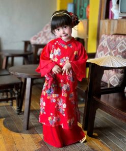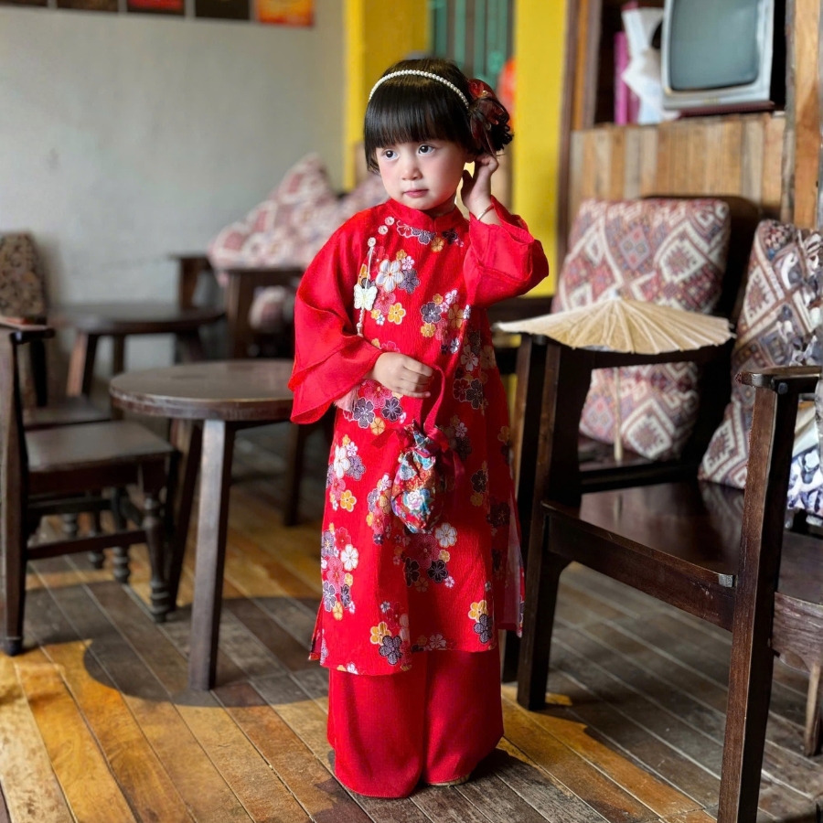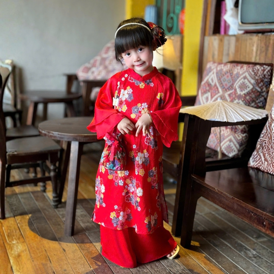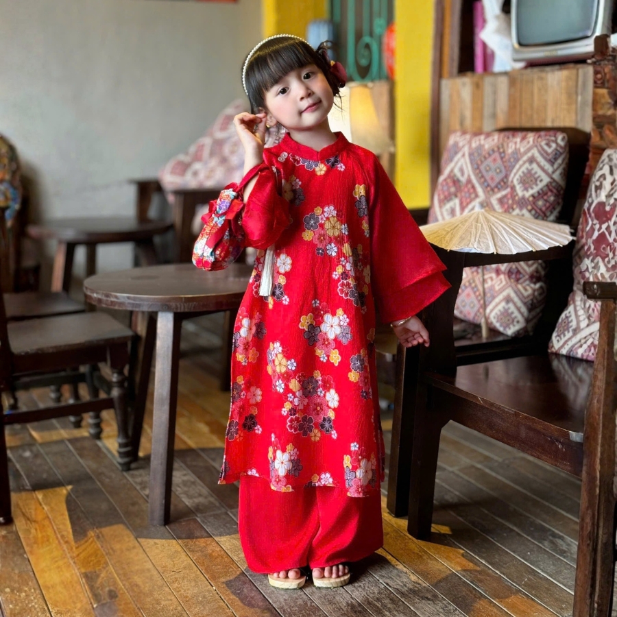 Áo dài thiết kế cách tân hiện đại với tay lồng bo nhẹ tạo độ bồng xinh, đồng thời tà áo dáng dài thướt tha giúp bé trông duyên dáng, nổi bật trong những dịp lễ Tết. Họa tiết hoa nhí in trên nền đỏ mang phong cách truyền thống nhưng vẫn vô cùng hiện đại, tạo cảm giác tươi mới và may mắn cho ngày đầu xuân. Form áo được tối ưu dành riêng cho bé gái, không bị rộng thùng thình cũng không quá ôm sát, rất dễ mặc và thoải mái vận động. Quần lụa ống suông màu đỏ đồng bộ với áo, tạo tổng thể hài hòa và cực kỳ sang. Thiết kế này phù hợp chụp ảnh, đi chơi Tết, dự tiệc hoặc trình diễn văn nghệ.