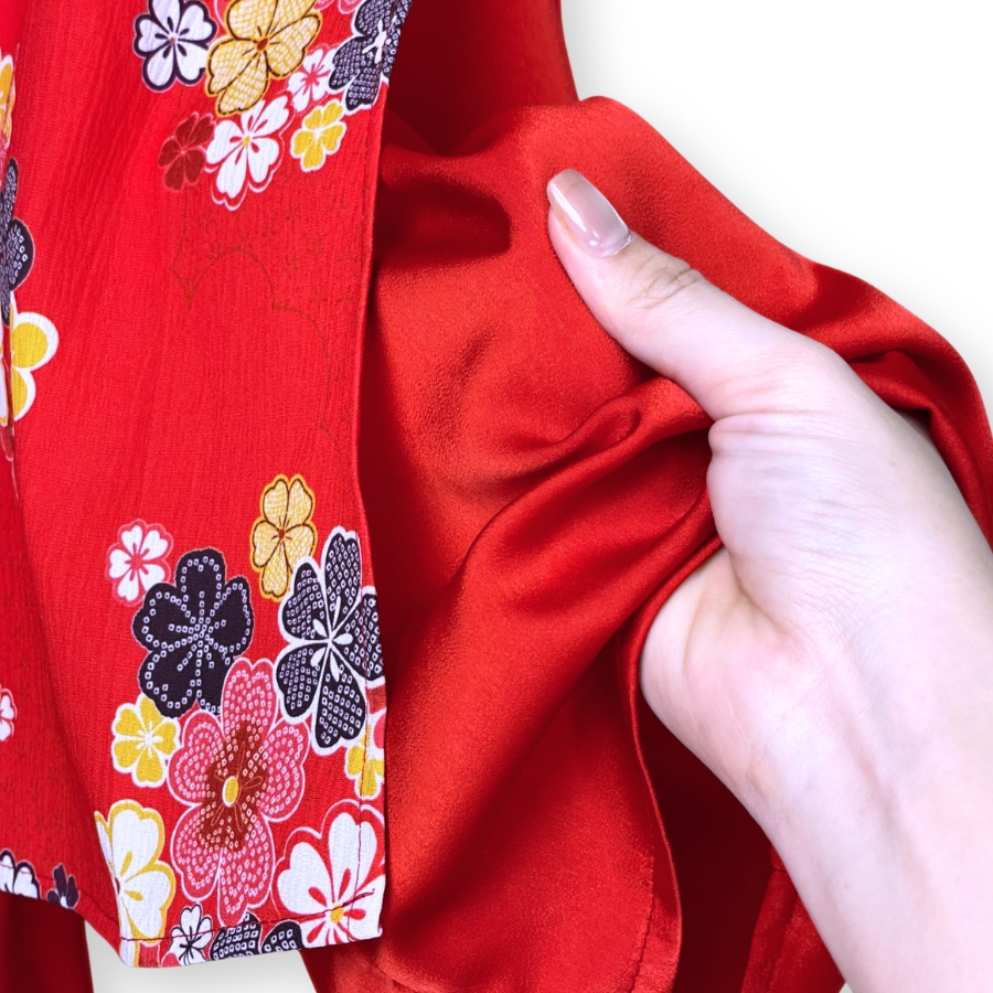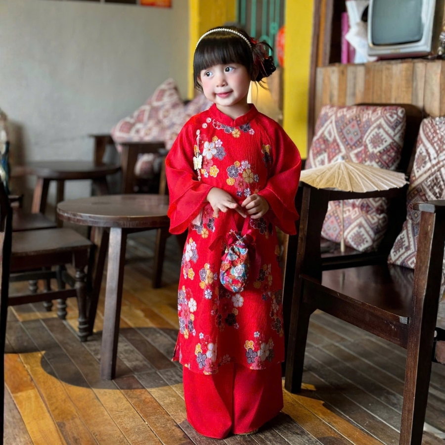 Màu đỏ nổi bật kết hợp họa tiết hoa nhí giúp bé trông rạng rỡ, tươi tắn đúng tinh thần Tết truyền thống nhưng cũng rất thời trang. Lụa sần co nhẹ và thoáng khí giúp bé vận động cả ngày mà không bị nóng hay khó chịu, cực kỳ phù hợp với thời tiết Tết Việt Nam. Bộ áo dài lên ảnh rất đẹp, tôn da, cực hợp để chụp hình gia đình, chụp kỷ niệm xuân hoặc chụp studio. Thiết kế sang, nhẹ, thoải mái và an toàn cho da bé vì chất liệu không gây kích ứng. Dễ phối thêm phụ kiện như giày búp bê, kẹp tóc, túi mini tạo set đồ hoàn chỉnh.
