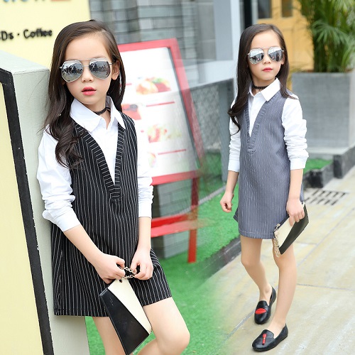 Sọc dọc của chiếc đầm xẻ sâu ngay phần cổ kết hợp cùng áo sơ mi bé gái cổ điển tay dài  khiến bé sở hữu style thanh lịch, sang trọng thu hút ánh nhìn của mọi người xung quanh (Hình ảnh minh họa)