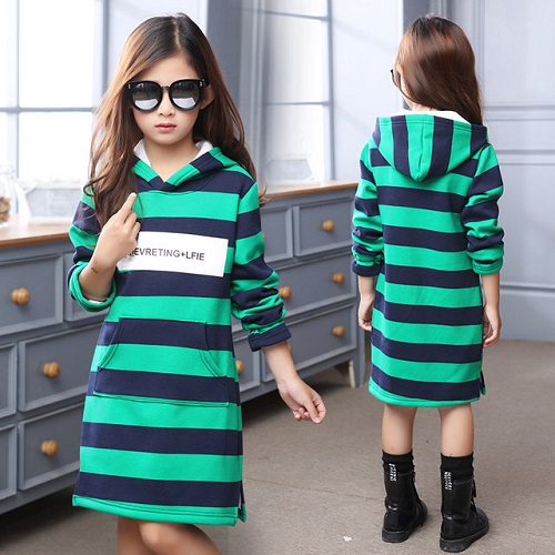 Đầm có nón, tay dài, chất liệu vải dầy dặn phù hợp với nơi có thời tiết lạnh hoặc những ngày mưa. Thiết kế sọc xanh dương, xanh lá đan xen tạo nên sự cá tính và khác biệt cho bé gái (Hình ảnh minh họa)