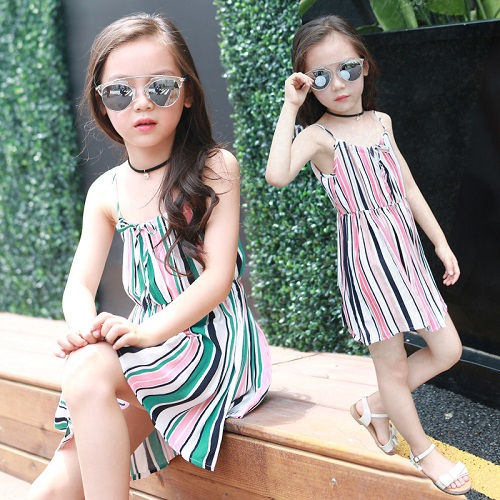 Bé yêu của bạn sẽ trở nên cá tính hơn với sọc đen, trắng, xanh lá và hồng xen kẽ nhau một cách cá tính và ấn tượng nhất. Kiểu đầm 2 dây xinh xắn tạo nên phong cách thời trang khá hút mắt, thích hợp cho những ngày nóng nực của mùa hè (Hình ảnh minh họa)