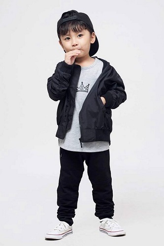 Áo khoác gió với màu đen mạnh mẽ, kết hợp cùng áo thun xám và quần nỉ đen tạo nên một tổng thể hòa và năng động cho bé trai, áp dụng đúng công thức không quá 3 gam màu trên tổng thể đồ (Hình ảnh minh họa)
