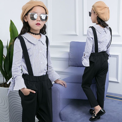 Chỉ đơn giản là chiếc áo sơ mi cách điệu, phối cùng với quần đen có 2 dây kéo dài qua phần vai cũng khiến thiết kế của bé nổi bật hơn (Hình ảnh minh họa)