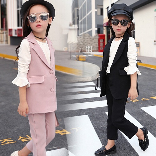 Thời trang bé gái cao cấp không chỉ đẹp mắt, có tính ứng dụng cao mà còn phảng phất nét thanh lịch, cổ điển, duyên dáng của một cô tiểu thư nhỏ. Gợi ý thứ 2 dành cho bé yêu của bạn chính là set quần áo vest cách điệu đáng yêu. Giảm đi một phần cứng ngắt, chuyên nghiệp, thêm vào đó là thiết kế cách điệu nằm ở phần áo như: áo blazer, bộ suit, quần jean bé gái xé gấu,…