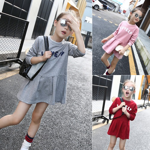 Váy dáng xòe xinh xắn với phần tay dài và hàng chữ LOVELY được thêu trước ngực tạo sự tinh tế về thời trang, thiết kế có 3 màu sắc như xám, hồng và đỏ phù hợp và tạo nhiều sự lựa chọn hơn cho bé