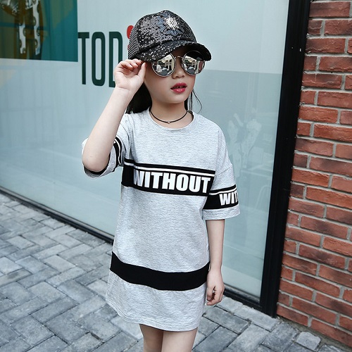 Đơn giản nhưng ấn tượng, thiết kế váy với tông xám nổi bật chữ màu trắng và nền màu đen. Các mẹ có thể kết hợp nón, giày thể thao cùng tông sao cho phù hợp với set đồ của bé