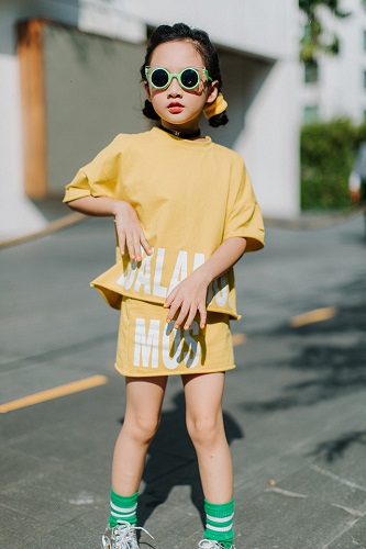 Tông màu truyền cảm hứng và tăng sự thời trang chính là thiết kế này. Áo và chân váy rời giúp bé dễ dàng hoạt động hơn. Kết hợp ăn ý với mắt kính và giầy khiến cho bé càng nổi bật hơn khi xuất hiện trong đám đông
